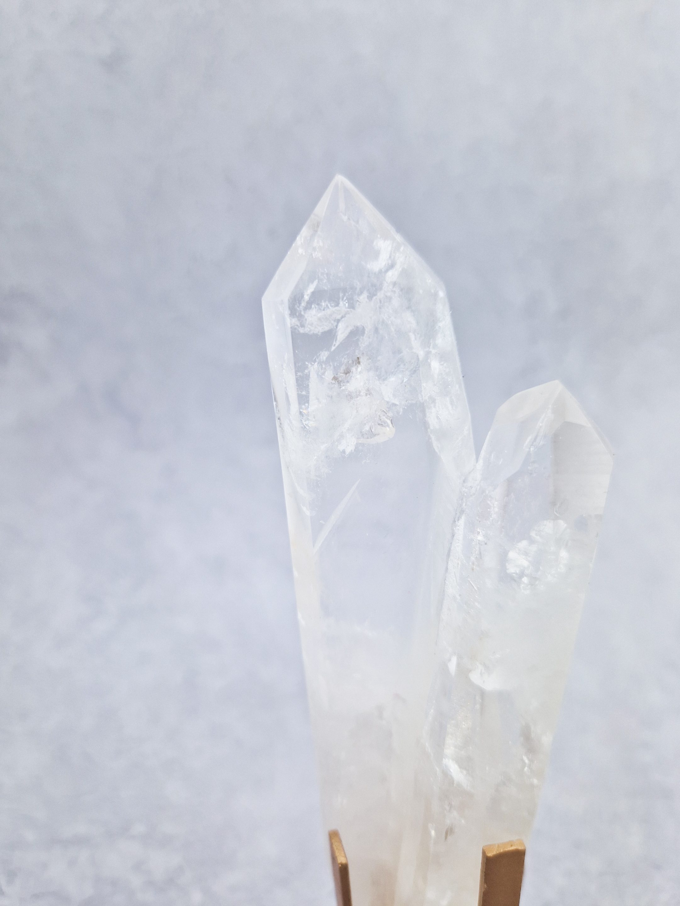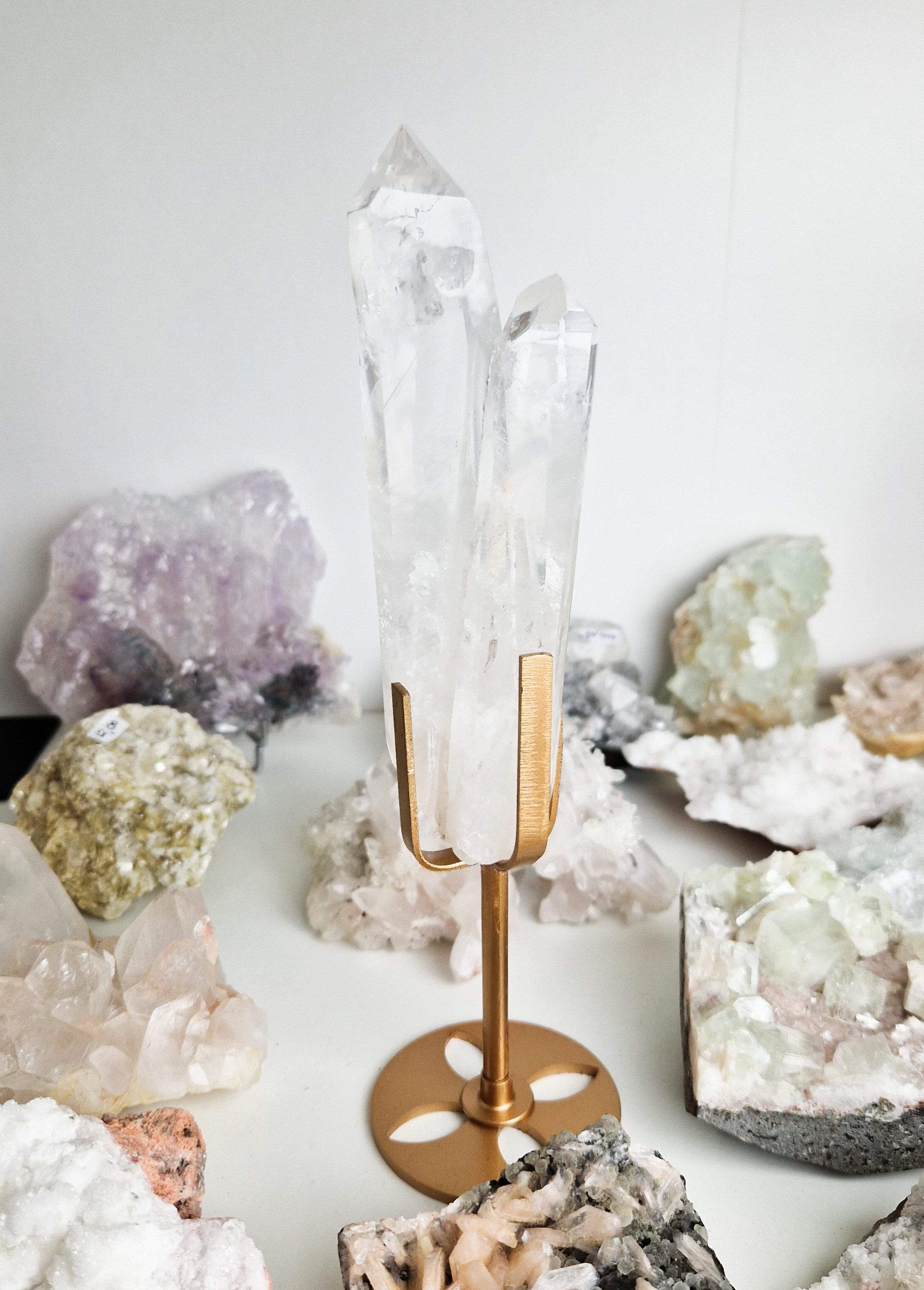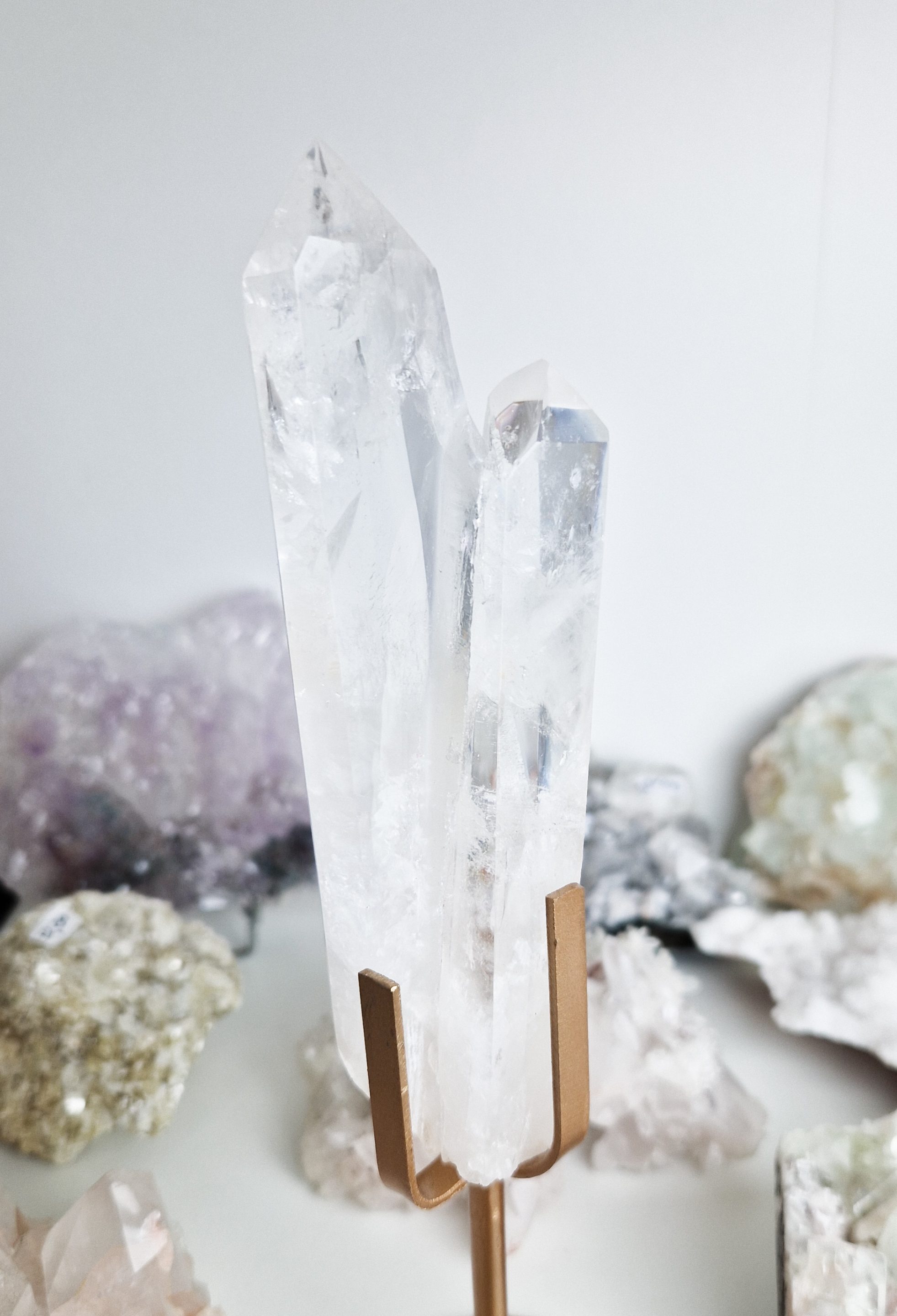 Prachtige bergkristal cluster op standaard van heldere en hoogwaardige kwaliteit. De transparante kristalpunten zijn zorgvuldig geselecteerd en hebben een opvallende vorm. De punten van deze cluster zijn licht gepolijst, waardoor ze een zachte glans krijgen en het licht extra mooi vangen.