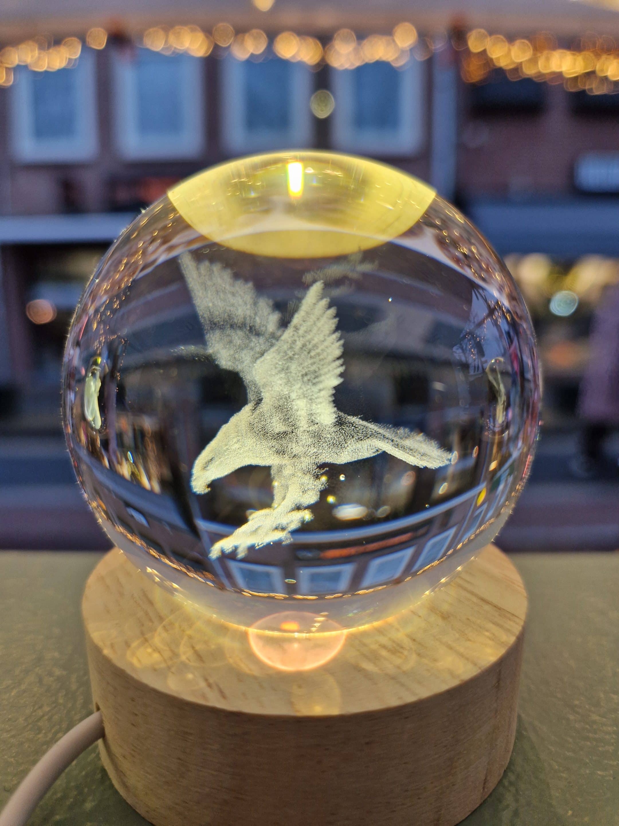 Deze prachtige bol met een 3d gravure van een adelaar is een echte blikvanger. Wanneer het lampje brandt, komt de gravure tot leven en verspreidt de bol een zachte, sfeervolle gloed.