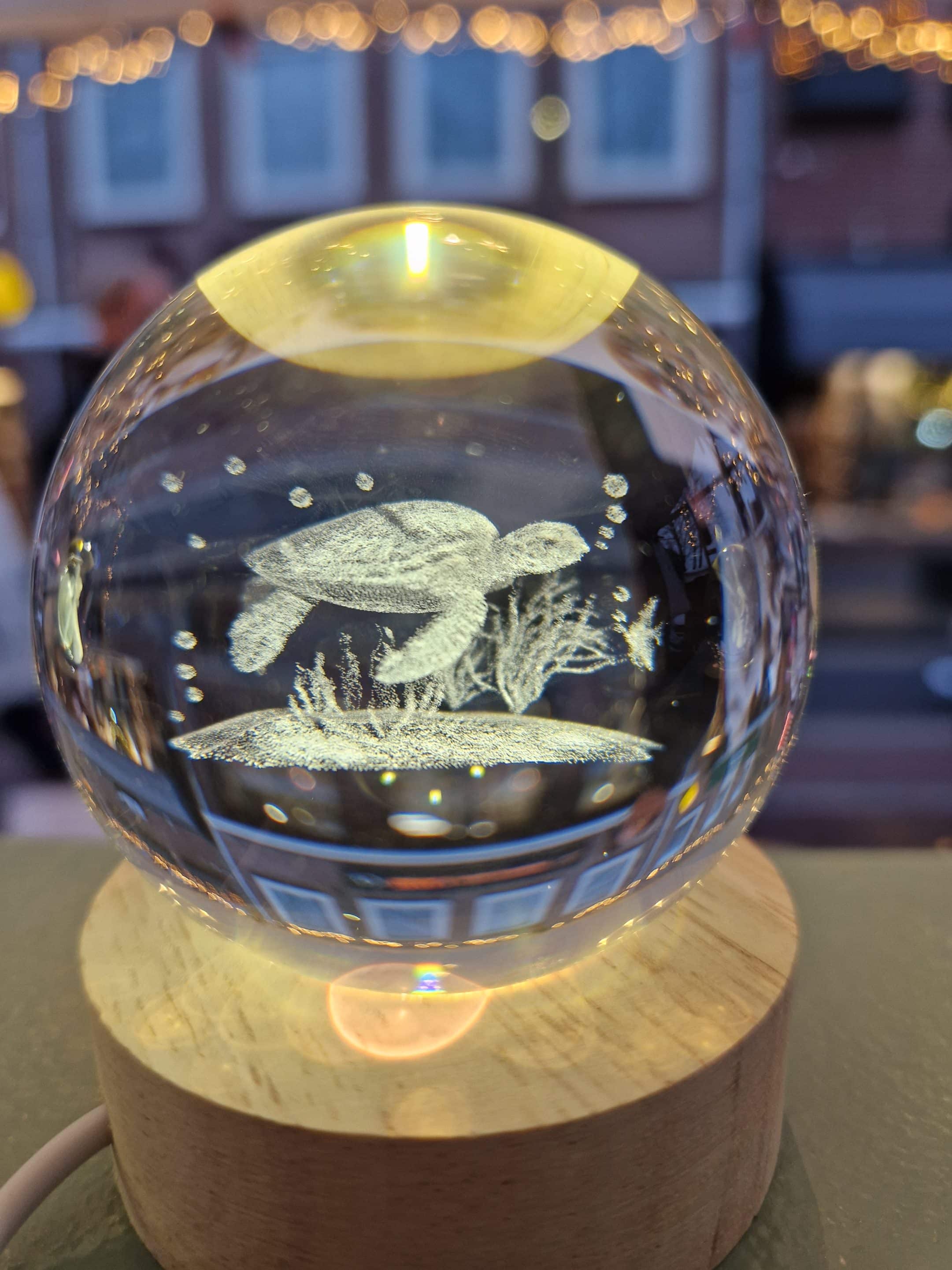 Deze prachtige bol met een 3d gravure van een schildpad is een echte blikvanger. Wanneer het lampje brandt, komt de gravure tot leven en verspreidt de bol een zachte, sfeervolle gloed.