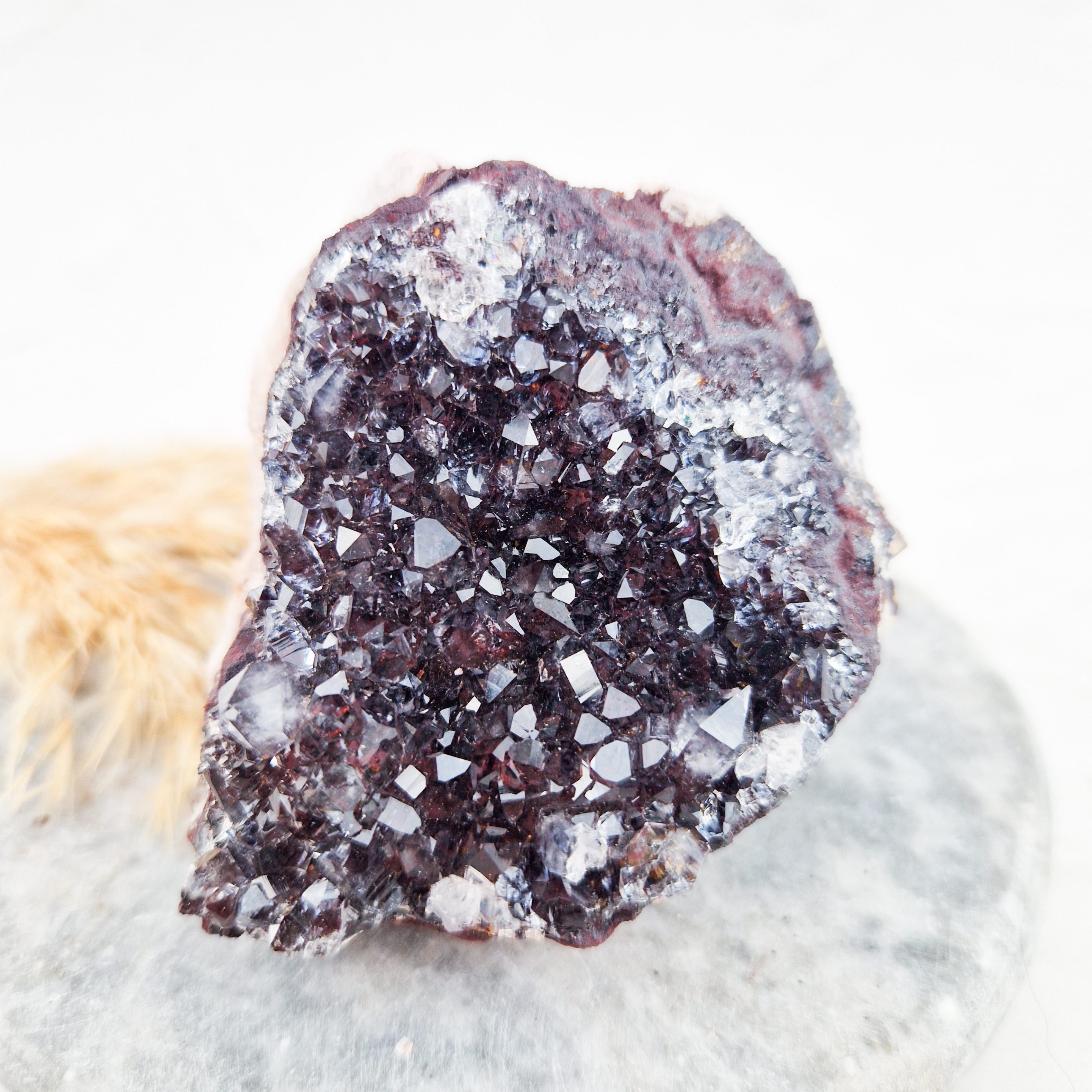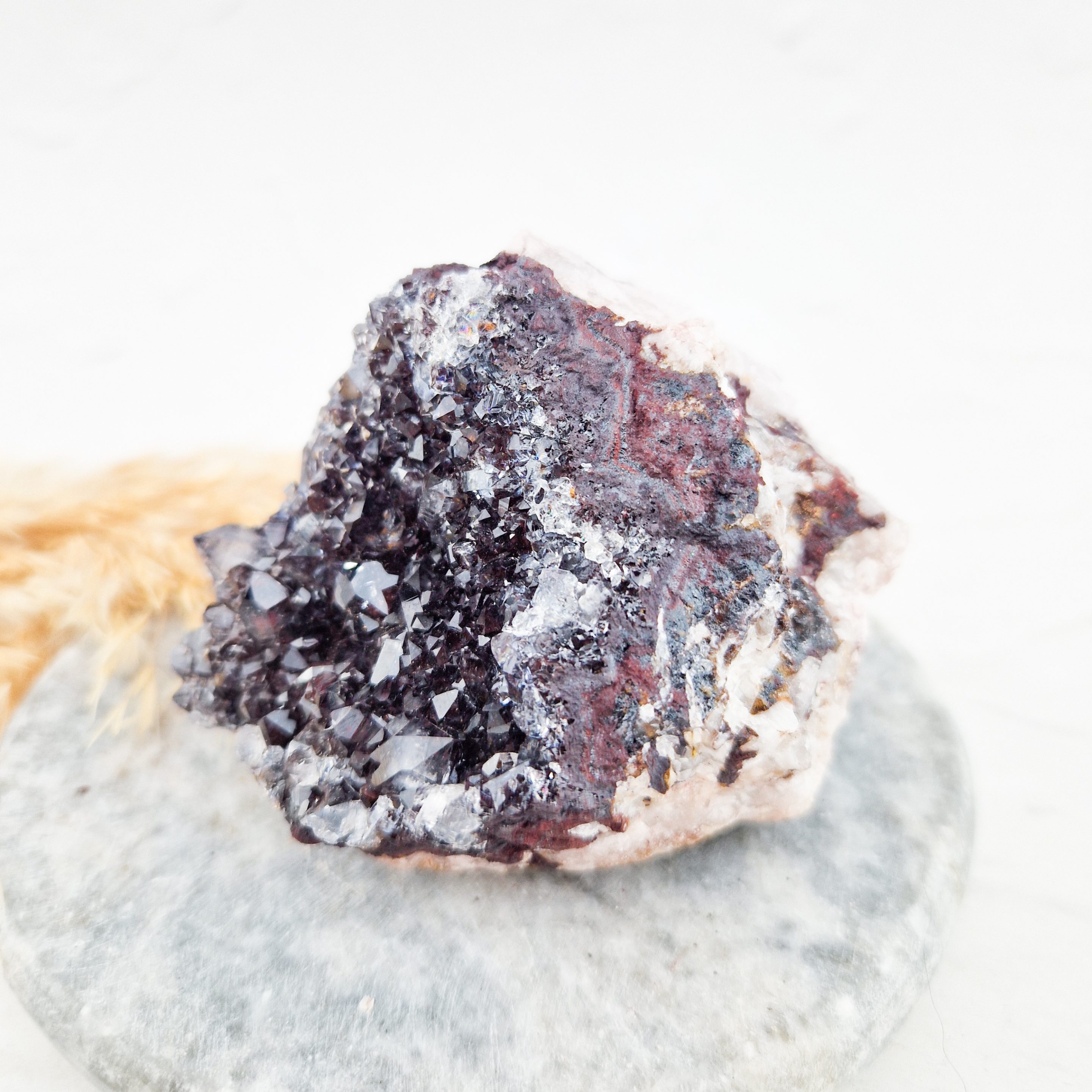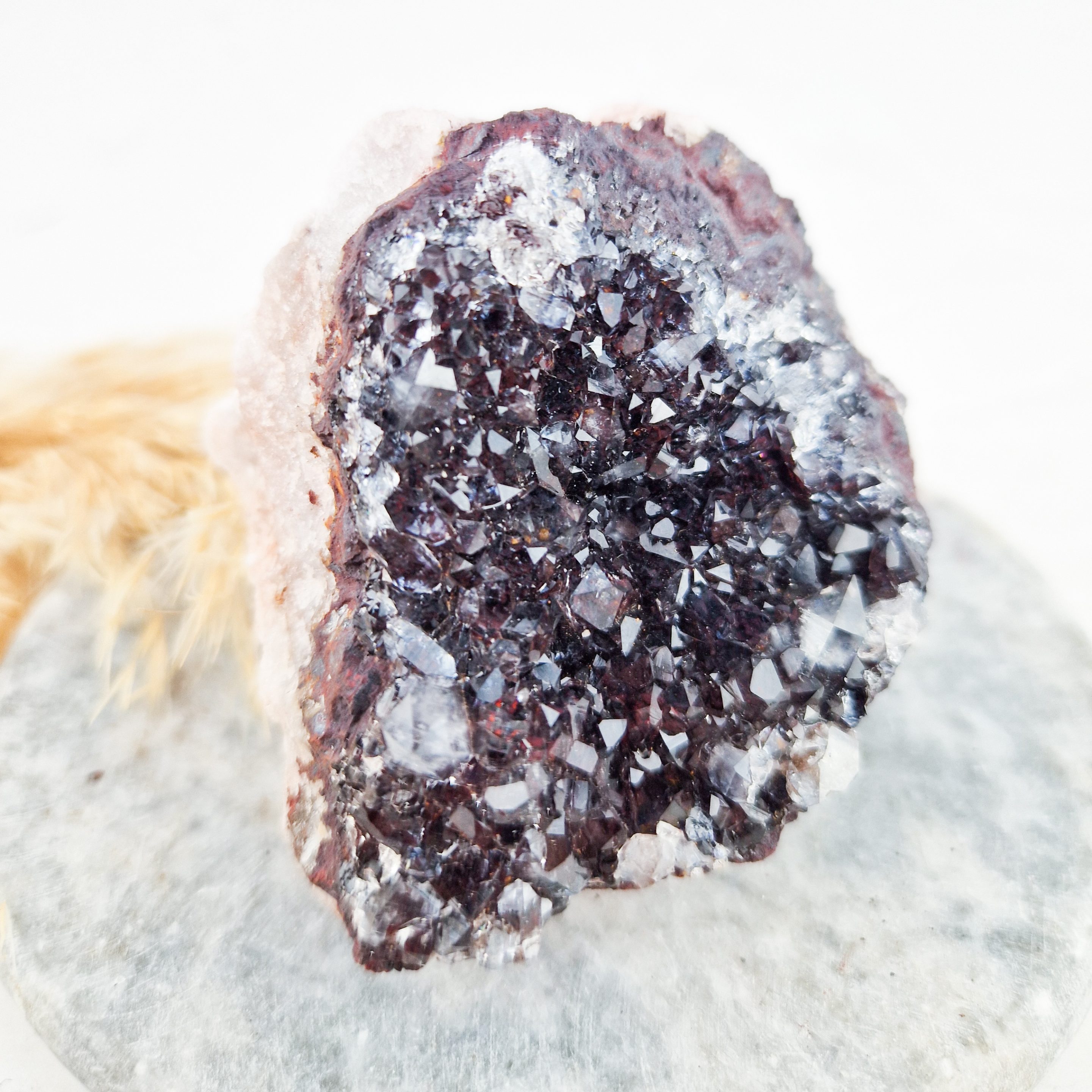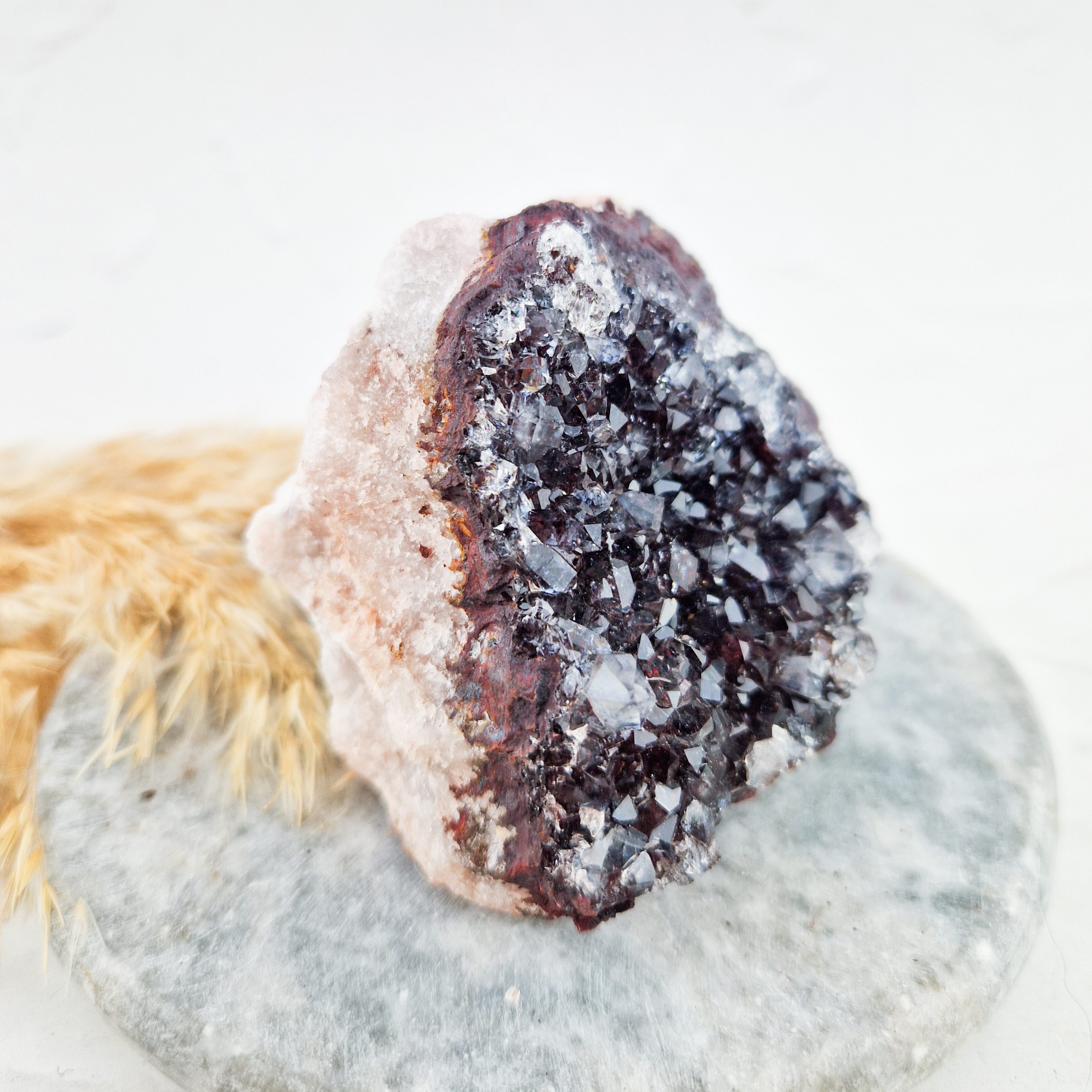 – De kleuren in deze clusters komen door verbindingen die zich vormen wanneer mangaan in een steen aanwezig is en vervolgens reageert op zijn omgeving (zoals oxidatie). De roze insluitingen lijken op bariet.
