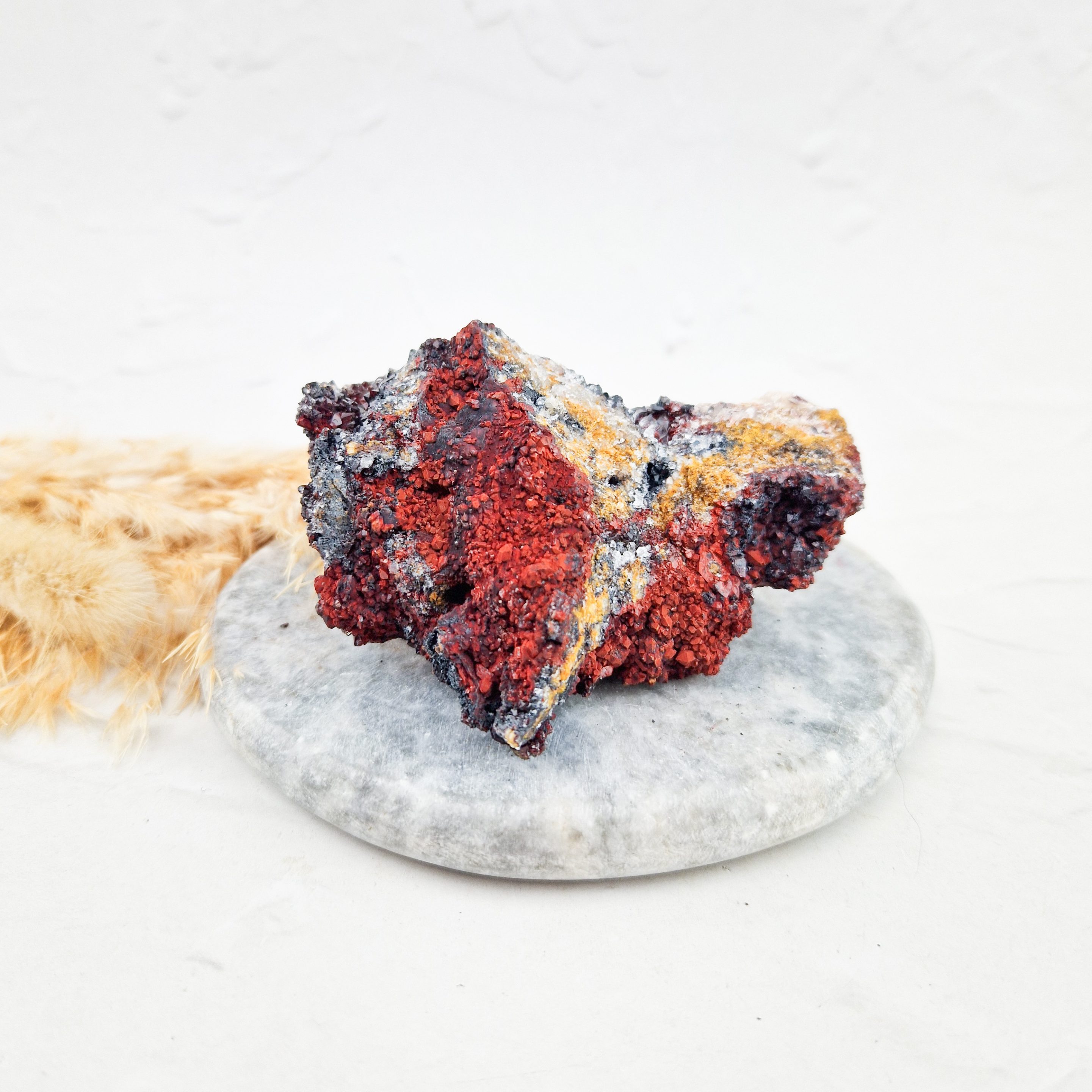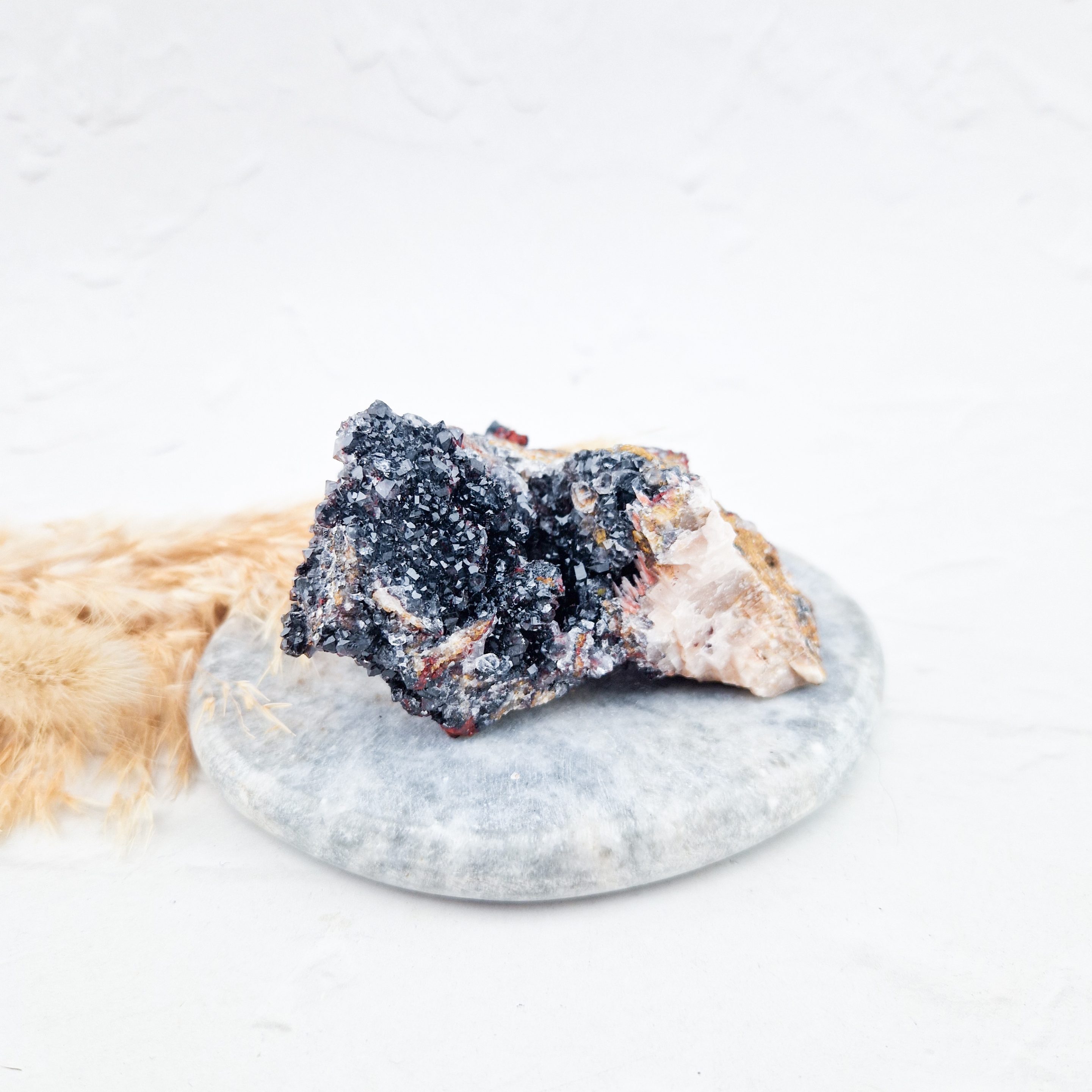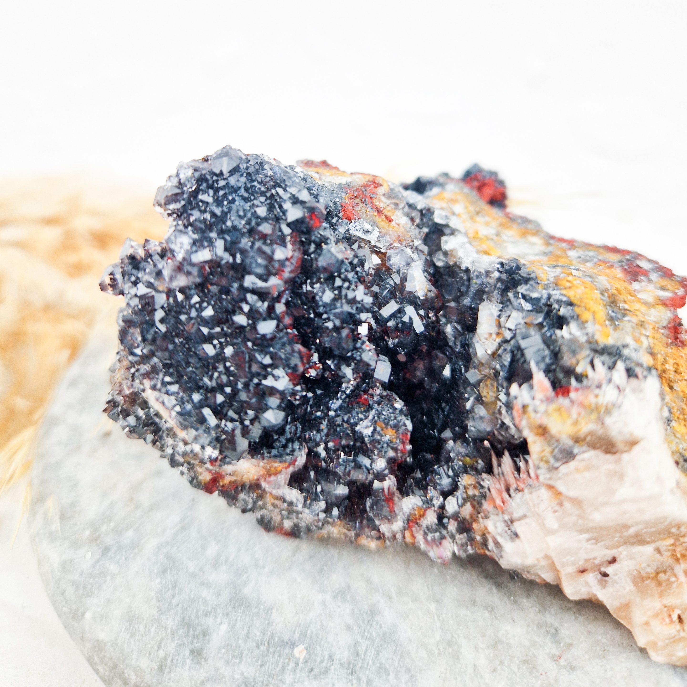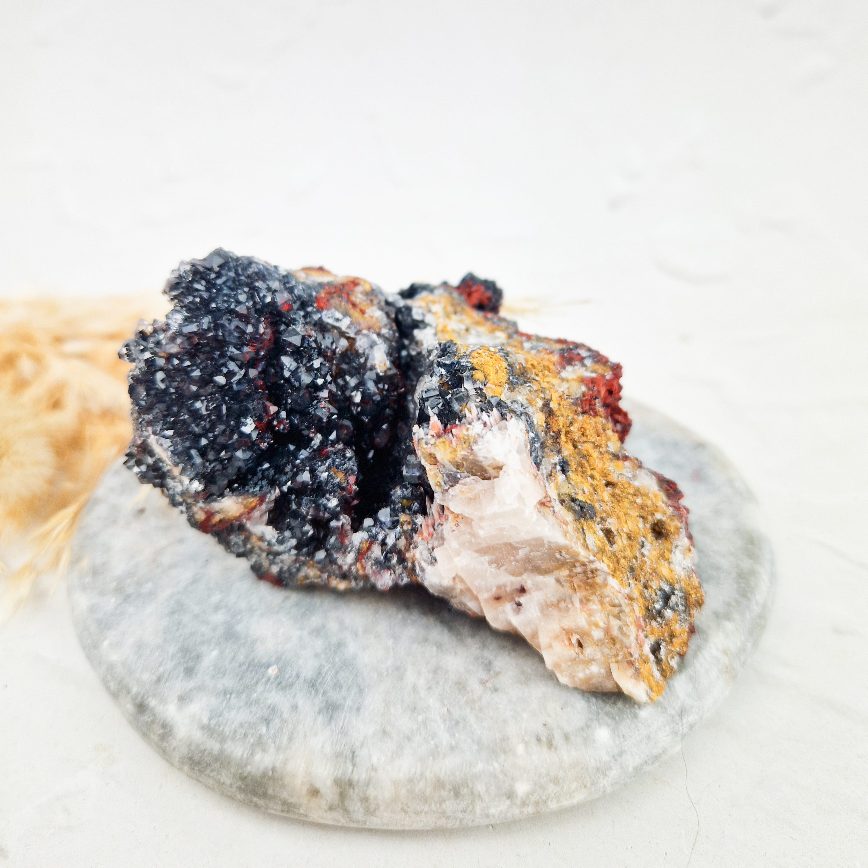 – De kleuren in deze clusters komen door verbindingen die zich vormen wanneer mangaan in een steen aanwezig is en vervolgens reageert op zijn omgeving (zoals oxidatie). De roze insluitingen lijken op bariet.