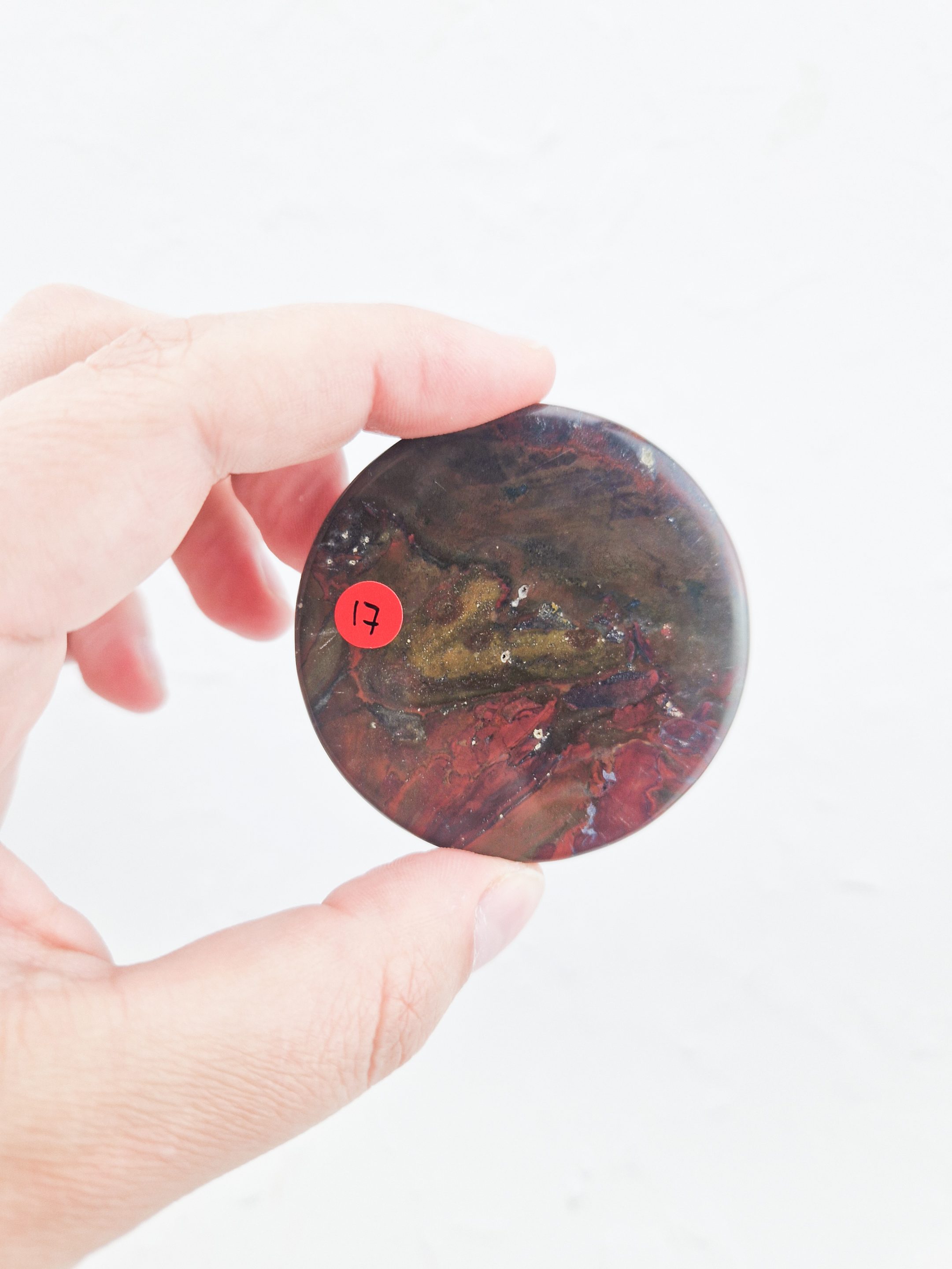 – Prachtig oceaan jaspis schijfje, leuk om neer te zetten ter decoratie of gebruik het schijfje als kleine onderzetter voor andere stenen.