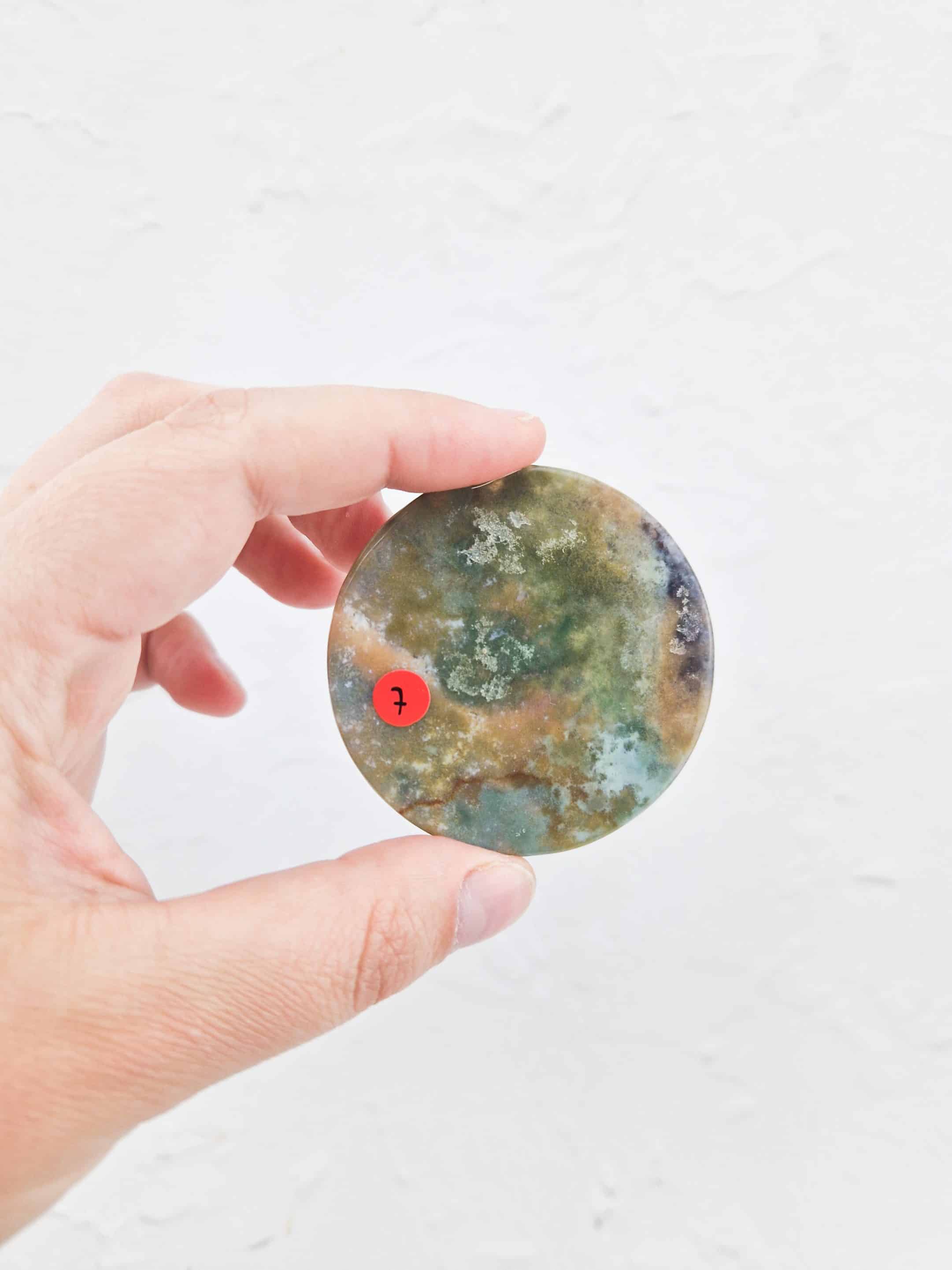 – Prachtig oceaan jaspis schijfje, leuk om neer te zetten ter decoratie of gebruik het schijfje als kleine onderzetter voor andere stenen.