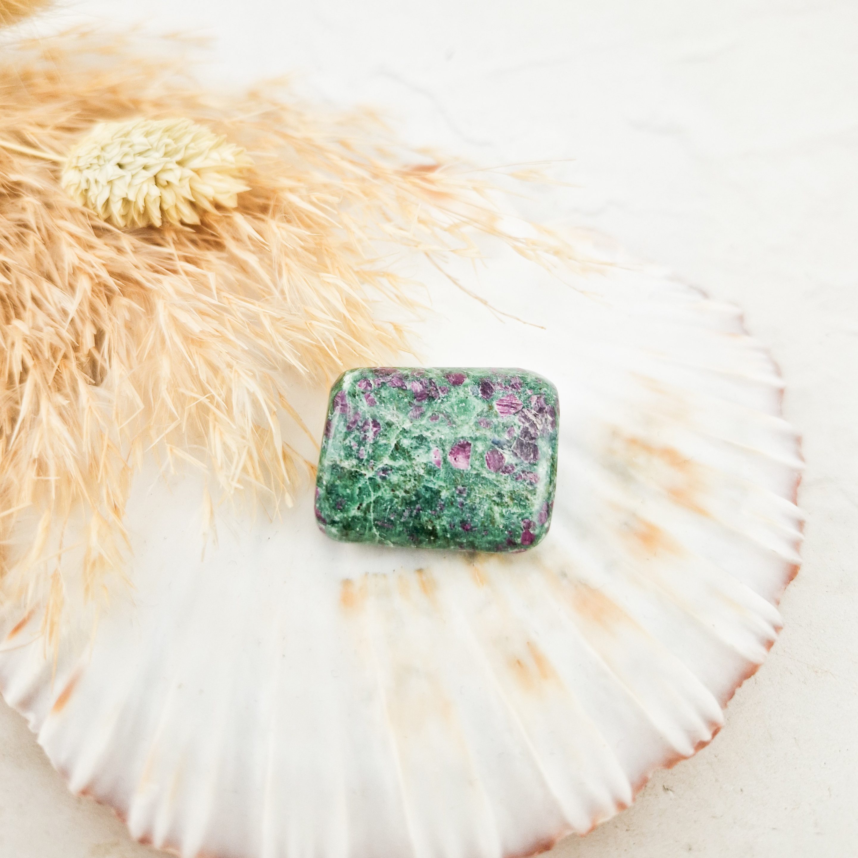 – Robijn in fuchsiet is een combinatiesteen waarbij robijn kristallen zijn ingesloten in een matrix van fuchsiet.