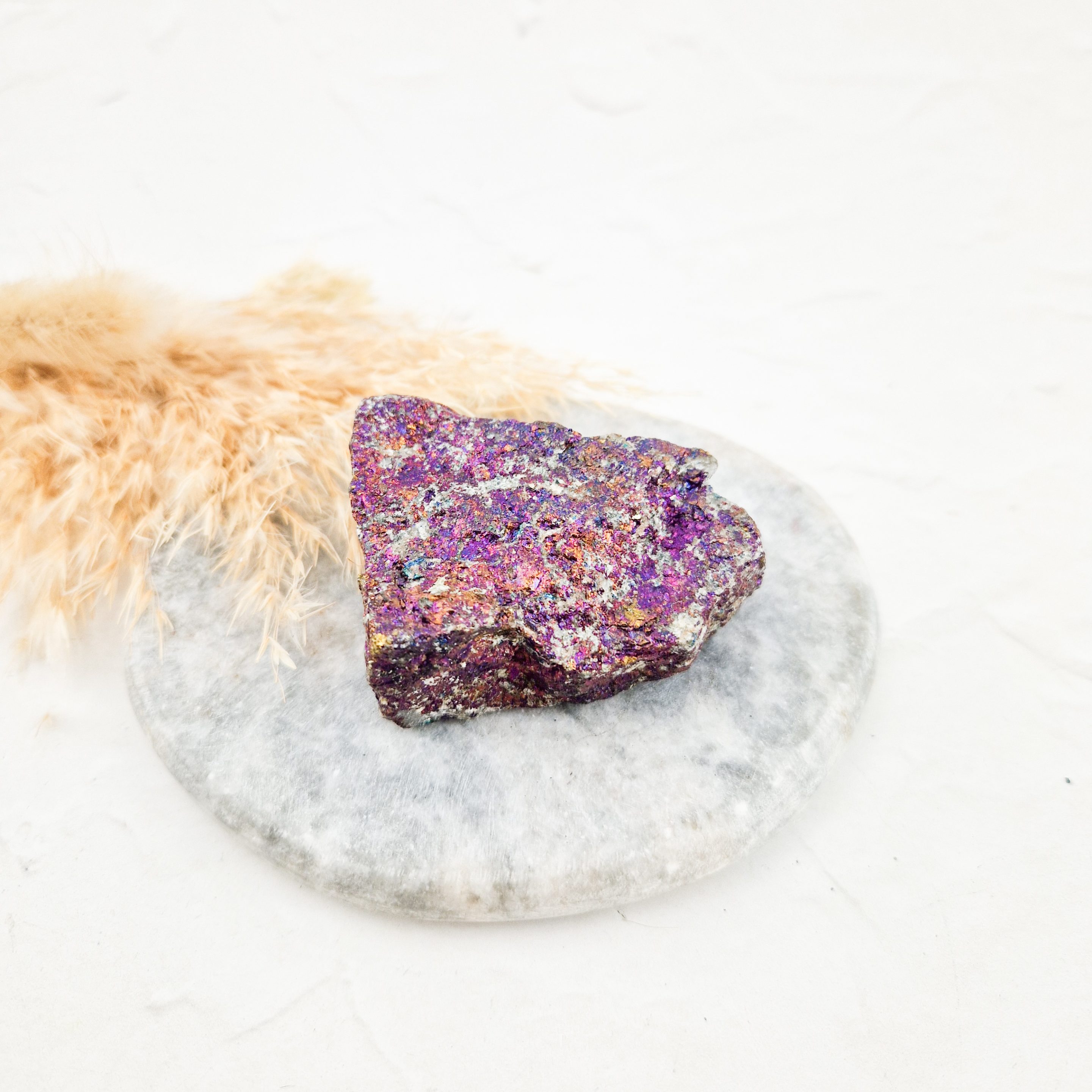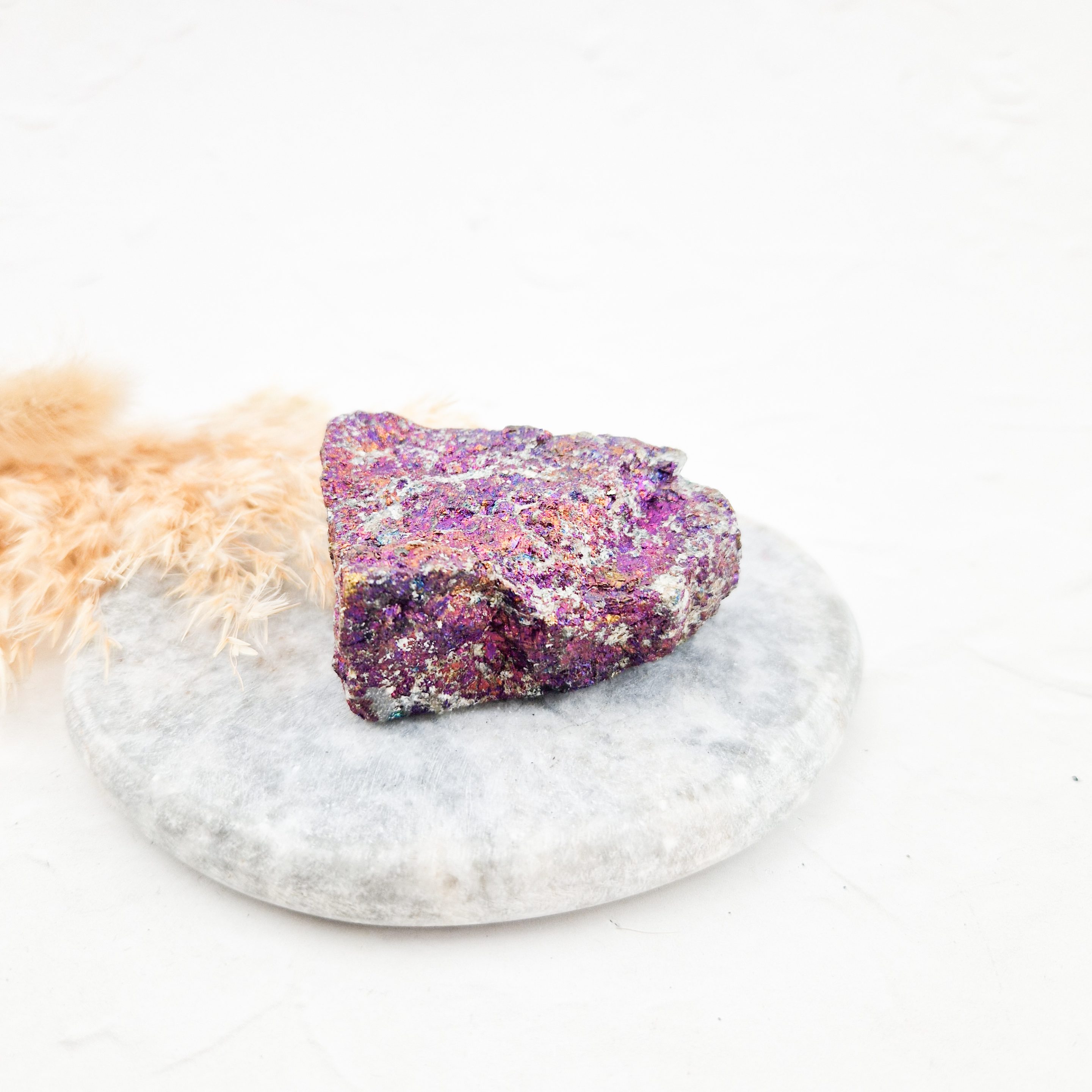 – Door oxidatie krijgt dit mineraal zijn bijzondere kleuren. Borniet kan met zuur behandeld worden om de iriserende kleuren te versterken. Ik durf niet te zeggen of dat bij deze borniet het geval is.