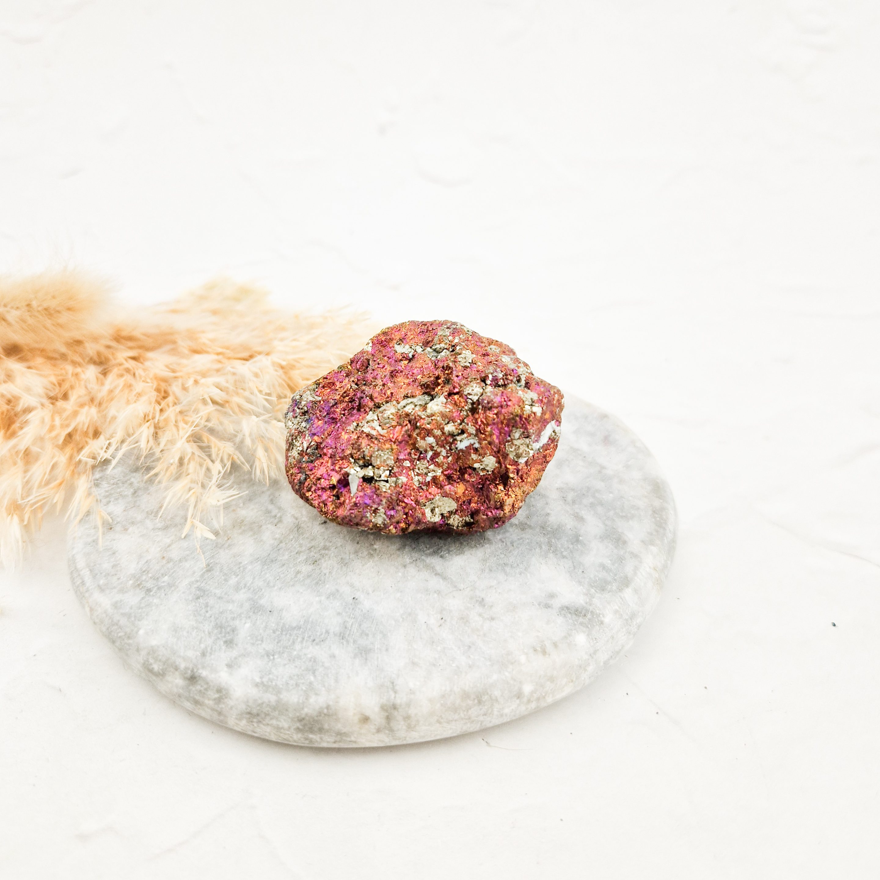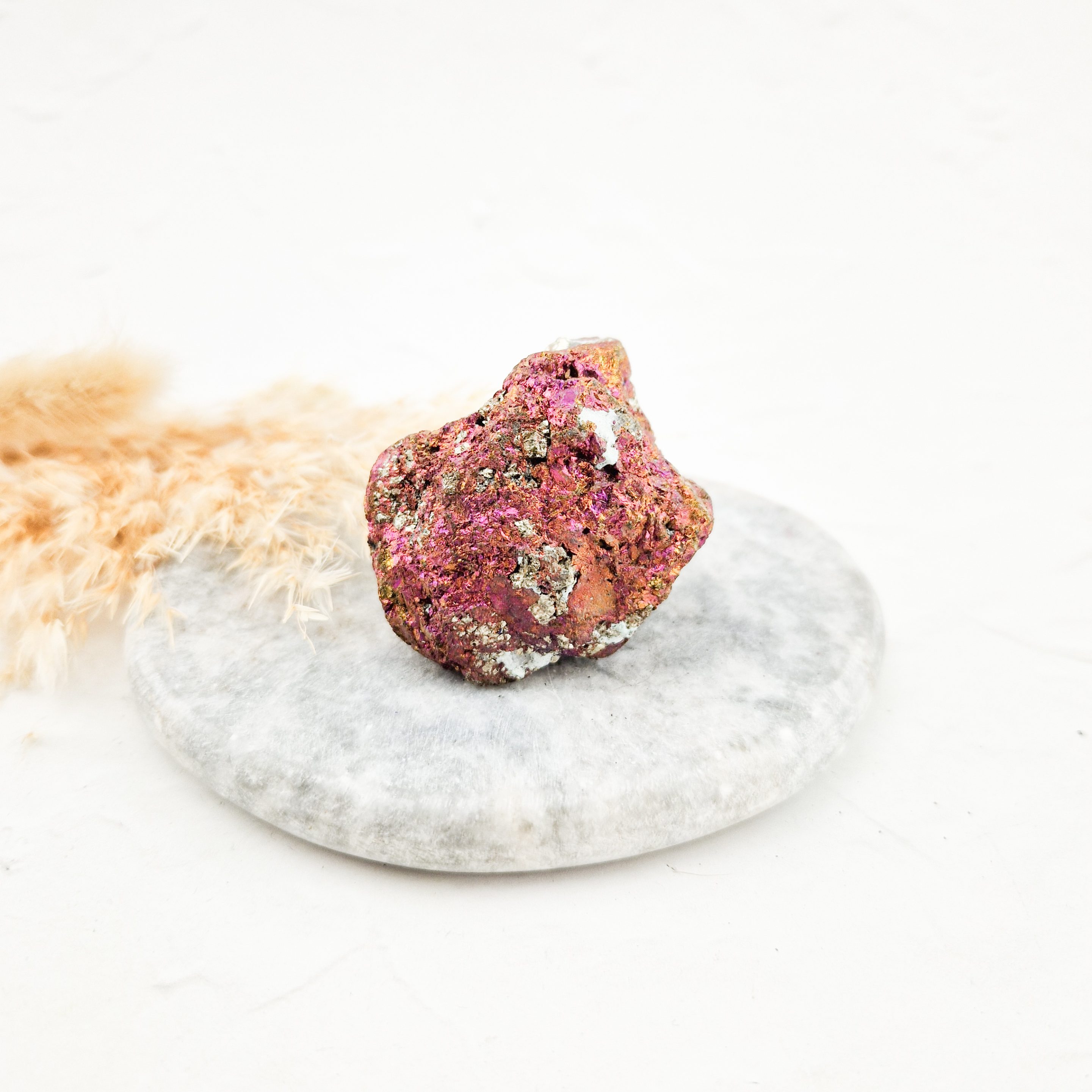 – Door oxidatie krijgt dit mineraal zijn bijzondere kleuren. Borniet kan met zuur behandeld worden om de iriserende kleuren te versterken. Ik durf niet te zeggen of dat bij deze borniet het geval is.