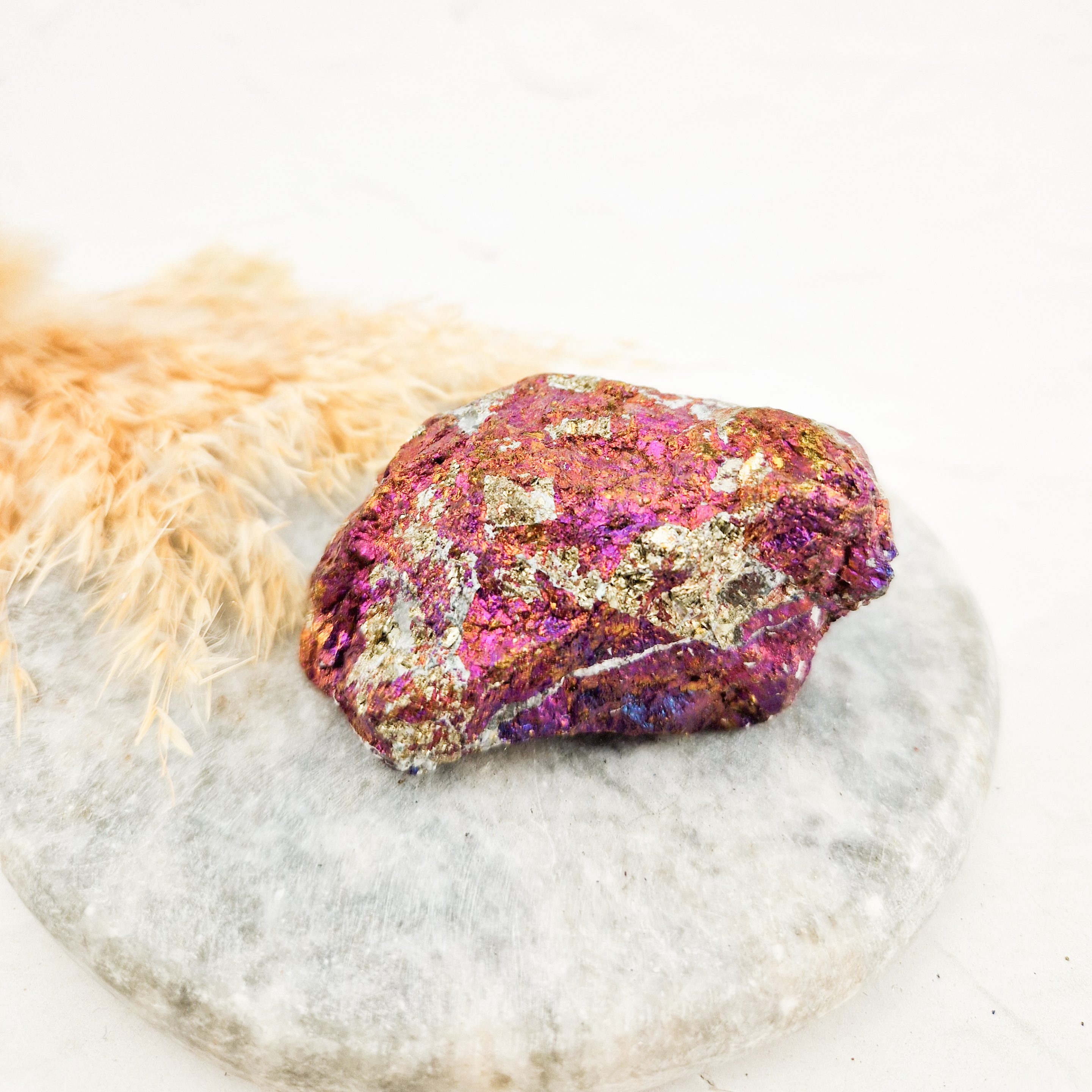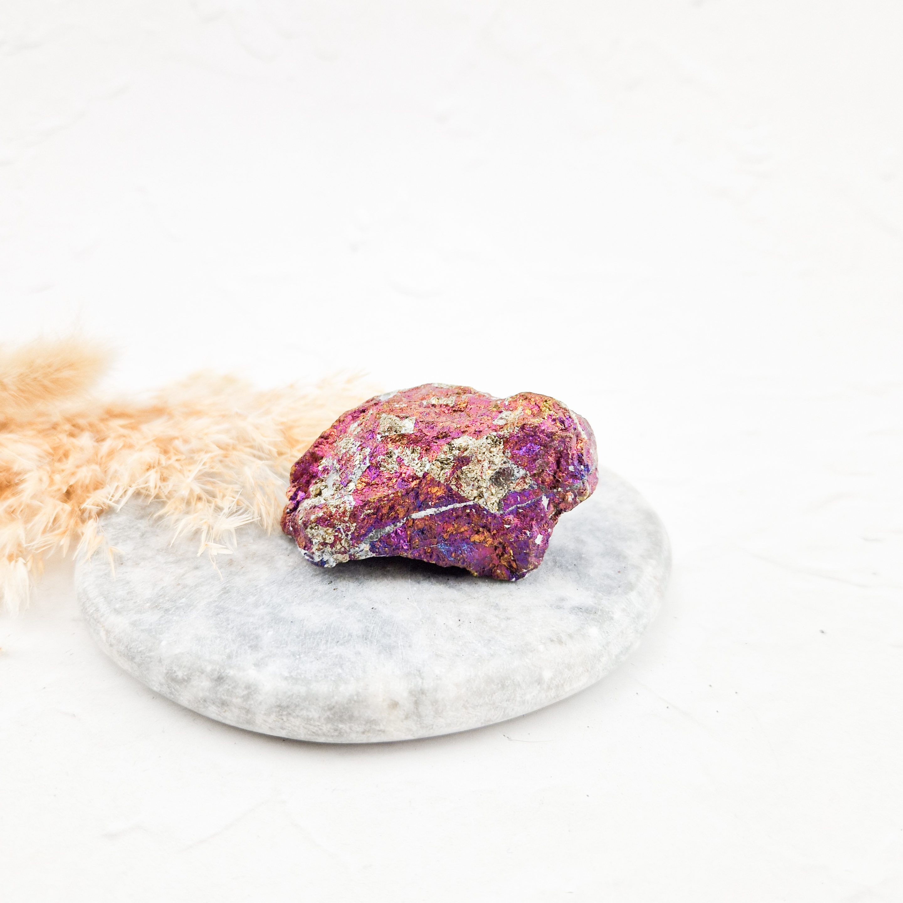 – Door oxidatie krijgt dit mineraal zijn bijzondere kleuren. Borniet kan met zuur behandeld worden om de iriserende kleuren te versterken. Ik durf niet te zeggen of dat bij deze borniet het geval is.